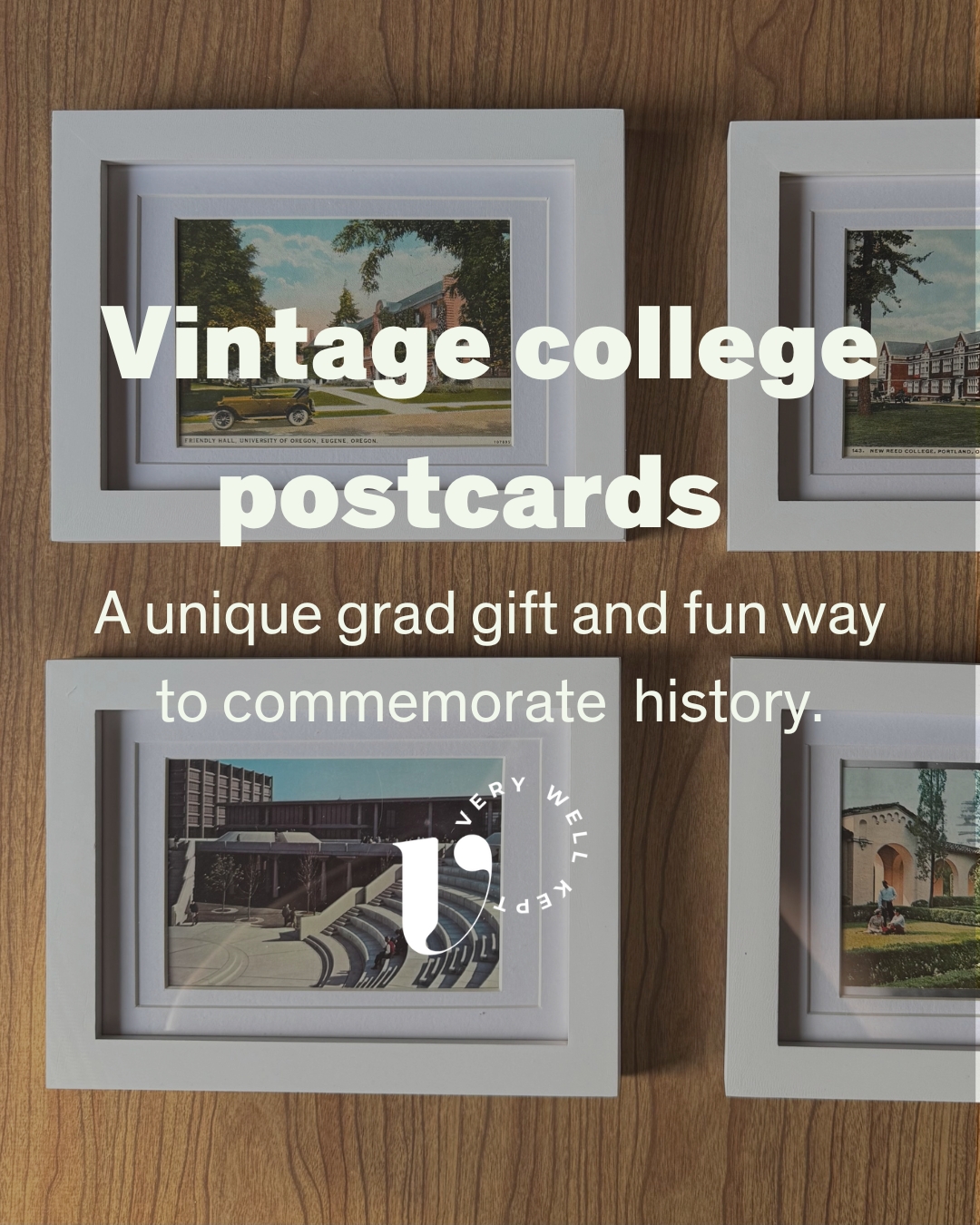 It’s almost graduation time and with all the excitement of shipping our youngest off to college I thought it would be fun to add a few vintage postcards featuring our family’s colleges to our postcard collection. As I was wrapping up this project it dawned on me that this would be such a unique and thoughtful graduation gift, or just a fun way to commemorate your family history.